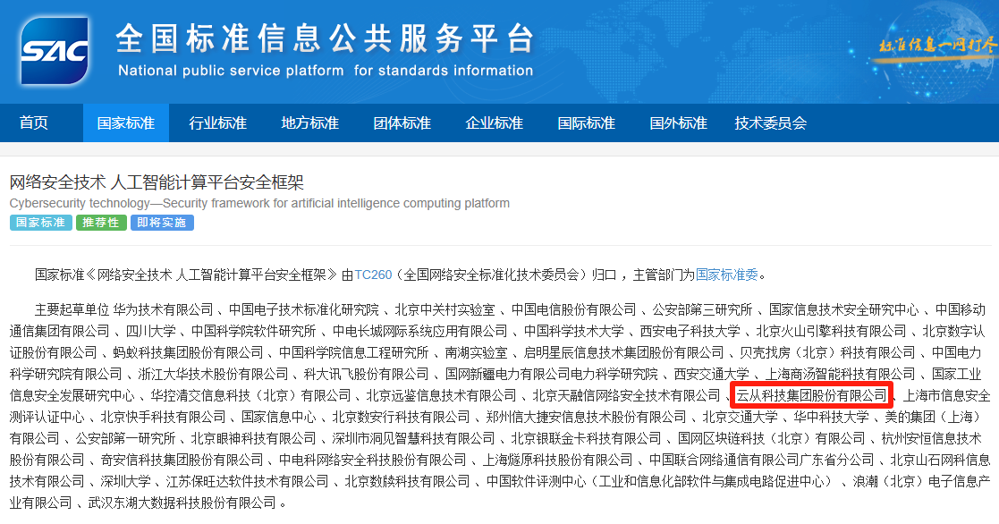 近日,國家標準GB/T 45958-2025《網(wǎng)絡(luò)安全技術(shù) 人工智能計算平臺安全框架》正式發(fā)布。該標準由全國網(wǎng)絡(luò)安全標準化技術(shù)委員會歸口管理,華為技術(shù)有限公司牽頭,云從科技作為核心起草單位之一,深度參與了標準制定工作。 這項將于2026年2月1日正式實施的國家標準,為人工智能計算平臺建立了系統(tǒng)化的安全框架,規(guī)定了安全功能、安全管理和角色安全職責,將有效應(yīng)對硬件漏洞、訓(xùn)練數(shù)據(jù)泄露、對抗樣本攻擊等新型安全威脅。